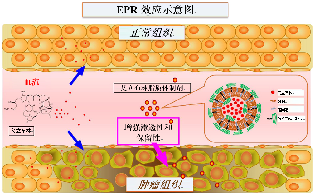 E7389-LF是一种新制剂,使用由脂质双层制成的脂质体来封装软海绵素类微管动力学抑制剂艾立布林。在肿瘤组织中,由于不完全的血管系统,血管内皮细胞之间存在视为允许大分子渗透的间隙。这种情况,除了不完全的淋巴功能之外,预计还能通过增强渗透性和保留性(EPR)效应,使得能够分别在肿瘤中以比正常组织更大的量输送和保留包括脂质体制剂在内的高分子量药物。因此,E7389-LF预计可以提高肿瘤组织中艾立布林的浓度。