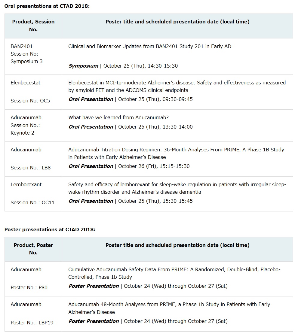 Eisai Co., Ltd. (Headquarters: Tokyo, CEO: Haruo Naito, “Eisai”) announced today that five oral presentations including a symposium, and two poster presentations, highlighting the latest data on its Alzheimer’s disease / dementia pipeline including anti-amyloid beta (Aβ) protofibril antibody BAN2401, oral beta secretase cleaving enzyme (BACE) inhibitor elenbecestat, anti-Aβ antibody aducanumab, and dual orexin receptor antagonist lemborexant, will be given at the 11th Clinical Trials on Alzheimer’s Disease (CTAD) conference taking place in Barcelona, Spain, from October 24 to 27. BAN2401, elenbecestat and aducanumab are being jointly developed by Eisai and Biogen Inc. (Headquarters: Cambridge, Massachusetts, United States, “Biogen”).