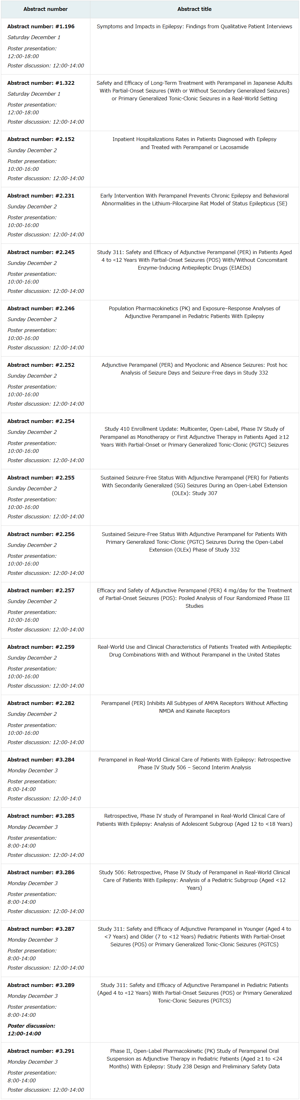 Nineteen poster presentations will be given by Eisai at AES 2018, including reports on the interim analysis results of a Phase III clinical study (Study 311) in pediatric patients aged 4 to less than 12 years as well as a presentation on sustained seizure-free status in the open-label extension phase of a Phase III clinical study (Study 307) in patients 12 years of age and older. Including Investigator Initiated Studies, more than 50 scientific posters on perampanel will be presented at AES 2018.
