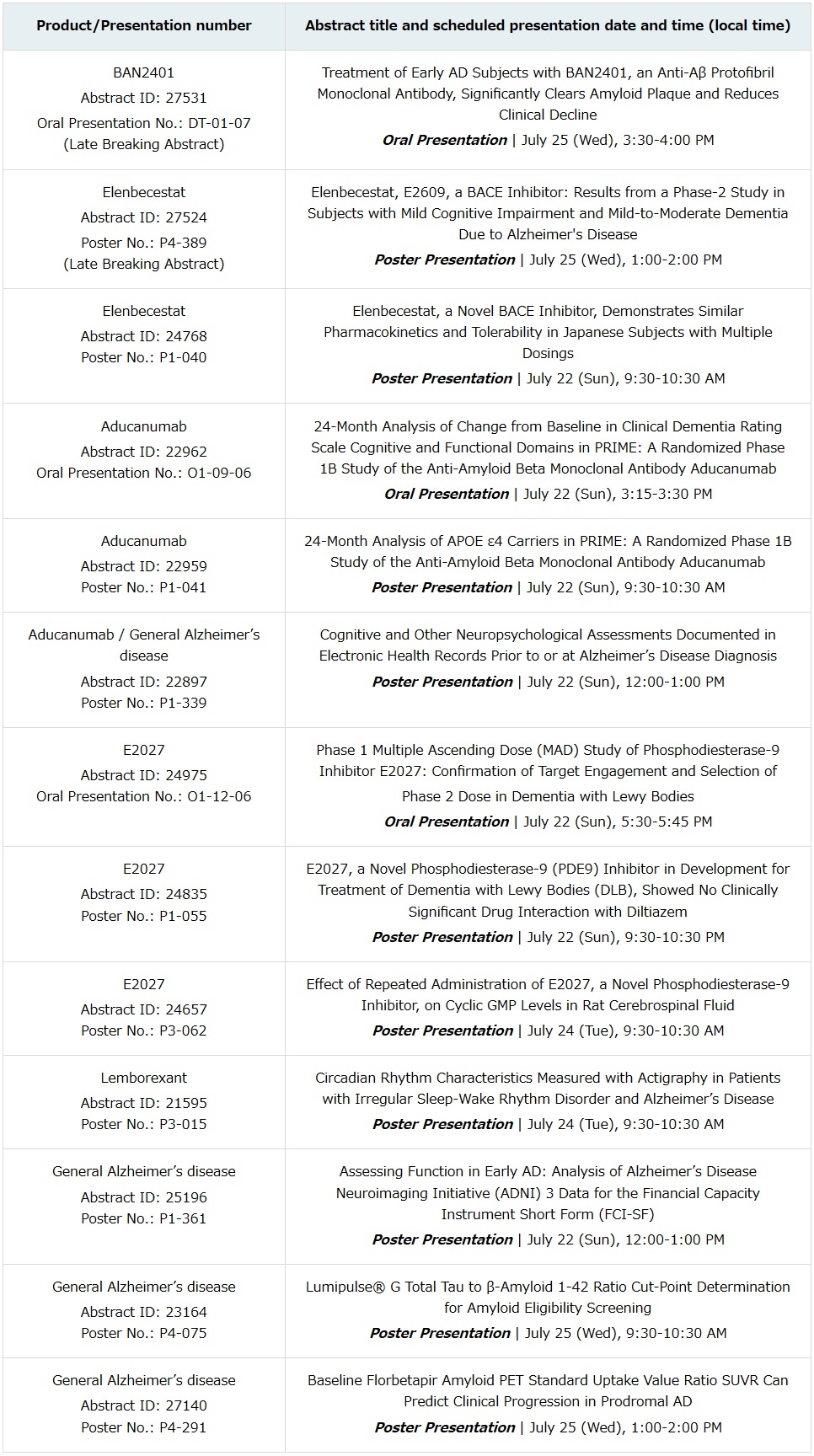 Eisai Co., Ltd. (Headquarters: Tokyo, CEO: Haruo Naito, “Eisai”) and Biogen Inc. (Nasdaq: BIIB) (Headquarters: Cambridge, Massachusetts, United States, CEO: Michel Vounatsos, “Biogen”) announced detailed results from the Phase II study (Study 201) with BAN2401, an anti-amyloid beta (Aβ) protofibril antibody, in 856 patients with early Alzheimer‘s disease as part of Session DT-01 “Recent Developments in Therapeutics (Presentation number: DT-01-07) at the Alzheimer’s Association International Conference (AAIC) 2018 being held in Chicago, Illinois, United States on July 25. This abstract was accepted for Late Breaking oral presentation at AAIC.